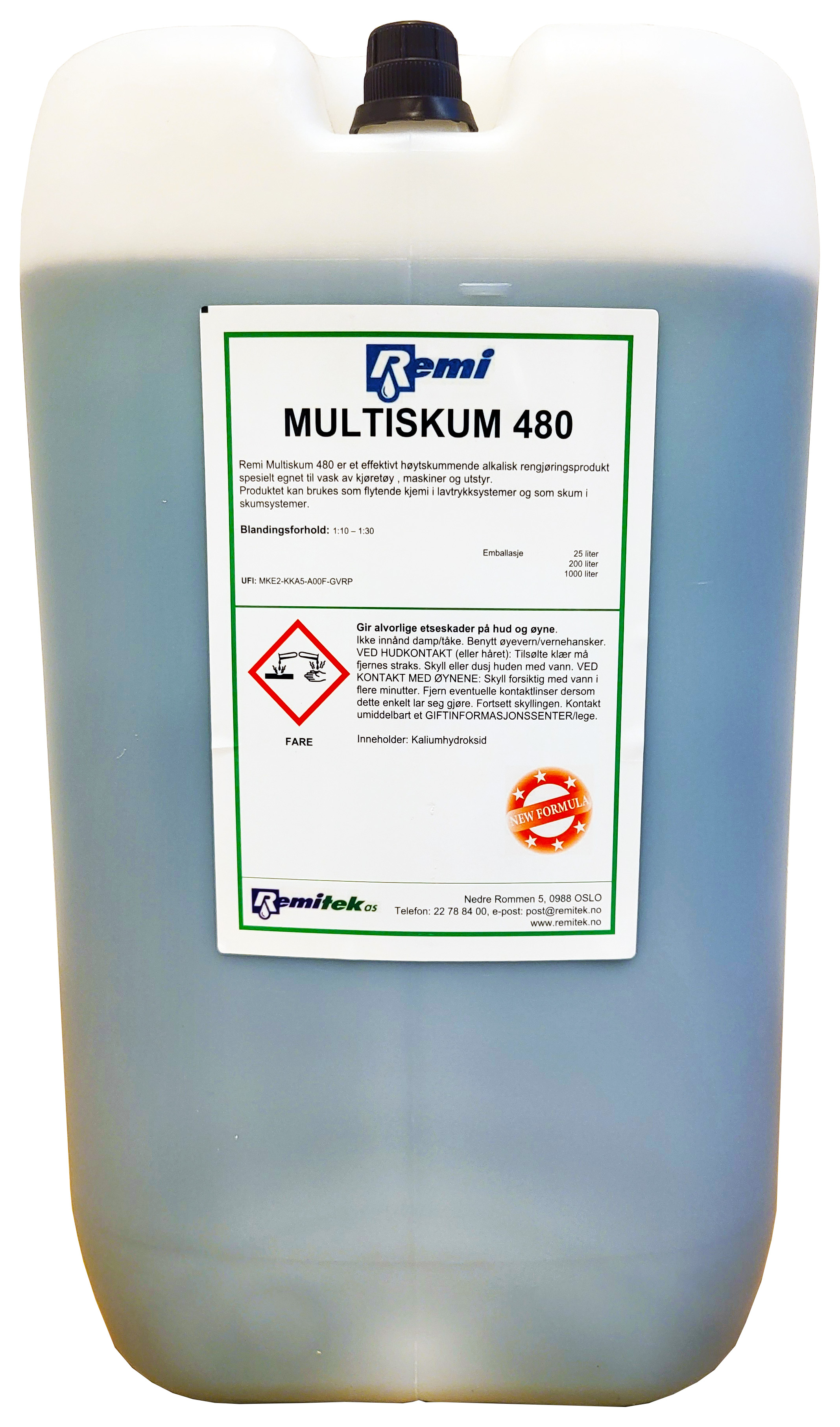 Remi Multiskum 480 er et høytskummende alkalisk rengjøringsmiddel for vask av kjøretøy. Produktet fjerner sot, olje, fett, veistøv, insekter og annen smuss.